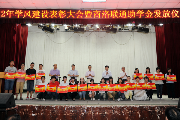 2012年11月29日,我校與商洛聯(lián)通公司簽署了《戰(zhàn)略合作協(xié)議》。今年商洛聯(lián)通公司在我校設(shè)立助學(xué)金,資助我校家庭經(jīng)濟(jì)困難學(xué)生20名,每人資助2000元。