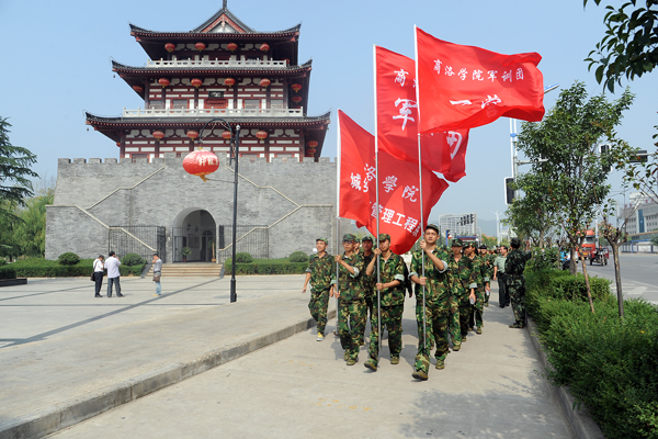 當(dāng)天上午8點(diǎn),全體新生身著迷彩服,從學(xué)校體育場(chǎng)出發(fā)至商鞅廣場(chǎng),再沿丹江公園返回,全程14公里。在4個(gè)小時(shí)的行軍過程中,新生們精神抖擻、隊(duì)列齊整、秩序井然,充分展示了軍訓(xùn)成果和我校學(xué)子樂觀向上、勇于挑戰(zhàn)、能吃苦耐勞的精神風(fēng)貌,引來了過往市民的注目和贊揚(yáng)。