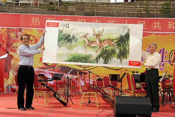 西安音樂學院黨委副書記、副院長孫衛(wèi)國,商洛市政府副秘書長劉仲林,校黨委書記張景書,黨委副書記、院長劉建林,黨委副書記左曉民,紀委書記王思懷,副院長陳永莊、魏書堂,商洛市教育局工會主席許丹莉,商洛聯(lián)通公司總經理溫長山,各系部、各職能部門黨政負責人和2013級全體新生一起觀看了演出。演出開始前,左曉民代表我校向西安音樂學院贈送了我校藝術系主任劉鳳林創(chuàng)作的《吉祥雙鹿圖》,象征兩校之間友誼長存。