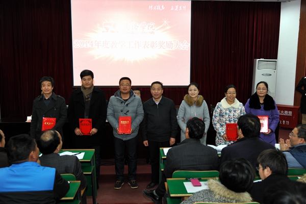 12月25日下午,我校隆重召開2014年度教學(xué)工作表彰獎(jiǎng)勵(lì)大會(huì),對(duì)本年度教學(xué)工作表現(xiàn)突出的集體和個(gè)人予以表彰獎(jiǎng)勵(lì),為省級(jí)本科教學(xué)工程項(xiàng)目授牌。校領(lǐng)導(dǎo)張景書、劉建林、左曉民、王思懷出席會(huì)議。大會(huì)由副校長(zhǎng)魏書堂主持。各院(部)、各系、各實(shí)驗(yàn)中心負(fù)責(zé)人,教學(xué)秘書及青年教師,學(xué)校辦公室、干部人事處、宣傳部、校團(tuán)委、學(xué)生處、招生就業(yè)處,形勢(shì)政策教研室、職業(yè)生涯規(guī)劃與就業(yè)指導(dǎo)教研室、心理健康教研室、國(guó)防與安全教育教研室負(fù)責(zé)人參加了表彰大會(huì)。
