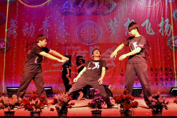 當(dāng)晚的大學(xué)生活動中心張燈結(jié)彩,喜氣洋洋,洋溢著歡快的節(jié)日氣氛。晚會在《讓我們舞起來》歌伴舞的精彩表演中拉開序幕,歌舞、相聲、小品、魔術(shù)、朗誦等16個形式多樣、精彩紛呈的節(jié)目贏得了臺下觀眾們的陣陣喝彩。其中,由街舞學(xué)社選送的舞蹈《keep On Dancing》,用動感的舞步和滑稽的肢體語言顯示了同學(xué)們豐富多彩的校園生活和活潑陽光的青春風(fēng)采;漢服學(xué)社的同學(xué)們邁著輕快靈動、曼妙翩躚舞姿,用一支《重回漢唐》展示了漢代文化的博大精深;相聲《學(xué)富五車》語言詼諧幽默,表演者們精彩的表演贏得了全場熱烈的掌聲;被同學(xué)們冠以“樓姨”昵稱的宿舍管理員用一場《歡樂草原》的舞蹈將晚會氣氛的推向高潮。藝術(shù)學(xué)院的五位老師一首富有戲劇性的歌曲聯(lián)唱,展現(xiàn)了我校老師嚴(yán)肅又不失活潑的精神風(fēng)貌。