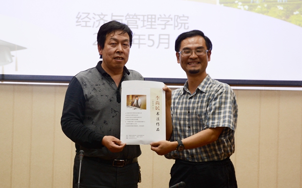 樊景博教授向兩位博士贈(zèng)送了以經(jīng)管學(xué)院辦學(xué)理念“經(jīng)世致用、管控未來”為內(nèi)容、由我校圖書館館長李尚民揮毫潑墨的書法作品。