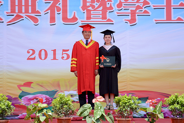 畢業(yè)典禮暨學(xué)士學(xué)位授予儀式在莊嚴(yán)的國(guó)歌聲中開始。為了感謝母校的培育之恩,全體2015屆畢業(yè)生向母校贈(zèng)送書法作品“博聞強(qiáng)志勤學(xué)尚德承校訓(xùn) 正道直行更續(xù)輝煌報(bào)師恩”,作為永久的紀(jì)念,張景書代表學(xué)校接受了禮物。
