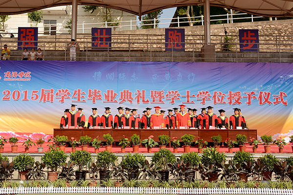 7月1日,我校舉行2015屆學(xué)生畢業(yè)典禮暨學(xué)士學(xué)位授予儀式。2615名畢業(yè)生奔赴祖國(guó)各地,開始人生新的征程。校黨委書記張景書、校長(zhǎng)劉建林、紀(jì)委書記王思懷、副校長(zhǎng)魏書堂、黨委副書記彭虎軍、副校長(zhǎng)范新會(huì)、副校長(zhǎng)劉寶盈出席,各院(部)黨政負(fù)責(zé)人、相關(guān)職能部門負(fù)責(zé)人、2015屆畢業(yè)生及輔導(dǎo)員、學(xué)生家長(zhǎng)代表參加了畢業(yè)典禮。畢業(yè)典禮由彭虎軍主持。