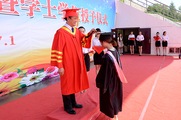 在學(xué)士學(xué)位授予儀式上,畢業(yè)生們依次走上主席臺(tái),校長(zhǎng)劉建林為獲得學(xué)士學(xué)位的畢業(yè)生正冠撥蘇、頒發(fā)學(xué)位證書,并同他們一一合影留念。