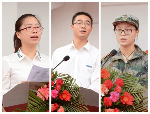 化學工程與現(xiàn)代材料學院教師曹寶月博士,2013級經(jīng)濟與管理學院學生魚慶彬,2015級生物醫(yī)藥與食品工程學院學生田夢婷分別代表學校教師、在校生和新生作了發(fā)言。