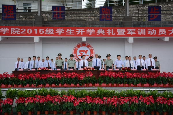 驕驕學子,今登堂明入室,星夜兼程圓好夢;巍巍黌門,才送往又迎來,躬耕不輟育國魂。9月8日,我校隆重舉行2015級學生開學典禮暨軍訓動員大會。校領(lǐng)導張景書、劉建林、王思懷、魏書堂、彭虎軍、范新會、劉寶盈,解放軍西安政治學院黨委常委、院務(wù)部部長邱仕偉大校,解放軍西安政治學院政治部副主任張新軍大校,解放軍西安政治學院軍事系教授、學生軍訓團團長劉京生大校,商洛市人民政府副秘書長宋奇志出席了大會。校黨委書記張景書向承訓教官授2015級學生軍訓團團旗,校黨委副書記、校長劉建林作了重要講話。大會由校黨委副書記彭虎軍主持。各院部黨政負責人、各職能部門負責人與2015級新生參加了大會。
