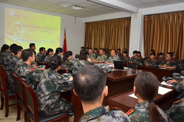 2015年9月9日,我校召開(kāi)中國(guó)軍事戰(zhàn)略與國(guó)家安全主題座談會(huì)。解放軍西安政治學(xué)院軍事學(xué)系教授、2015級(jí)新生軍訓(xùn)團(tuán)團(tuán)長(zhǎng)劉京生大校,軍訓(xùn)團(tuán)副團(tuán)長(zhǎng)莊超中校,軍訓(xùn)團(tuán)副團(tuán)長(zhǎng)伊明強(qiáng)少校出席本次活動(dòng)。武裝部部長(zhǎng)、軍訓(xùn)團(tuán)政委石啟英主持座談。
