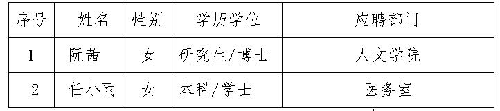 根據(jù)陜西省人社廳《關(guān)于陜西省事業(yè)單位公開招聘人員辦法》規(guī)定及《商洛學(xué)院2020年人才招聘計劃》,經(jīng)過資格審查、試講(筆試)、專家面試等環(huán)節(jié)考察,并經(jīng)院長辦公會2020年8月19日研究,同意招聘阮茜等2位同志來我校工作,現(xiàn)予以公示。如有異議,請于2020年8月27日前向人事處或紀委辦公室反映。