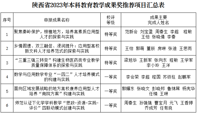 根據(jù)《關(guān)于開展2023年高等教育教學(xué)成果獎評審工作的通知》(陜教函〔2023〕1299號)文件精神,我校認(rèn)真組織開展高等教育教學(xué)成果獎申報工作,經(jīng)各院(部)推薦,校內(nèi)外專家評審,學(xué)校教學(xué)工作委員會審定,擬推薦《聚焦秦嶺保護,根植地方,培養(yǎng)高素質(zhì)應(yīng)用型人才的探索與實踐》等6個項目(見下表)申報2023年陜西省高等教育教學(xué)成果獎,現(xiàn)予以公示。