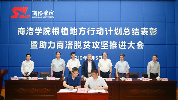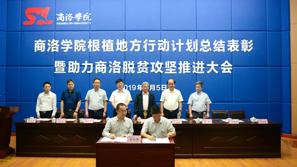 會議總結(jié)了我校根植地方行動計劃三年來取得的成效及經(jīng)驗,表彰了根植地方行動計劃先進(jìn)集體及先進(jìn)個人,頒發(fā)了2019年“趙鵬大院士獎教金”,為6個助力商洛脫貧攻堅人才服務(wù)團(tuán)授旗。會上,我校與商洛高新區(qū)(商丹園區(qū))管委會簽訂了《合作共建商洛高新區(qū)創(chuàng)新創(chuàng)業(yè)示范園協(xié)議書》,與陜西森弗天然制品有限公司簽訂了《共建商洛學(xué)院-森弗健康學(xué)院協(xié)議》。
