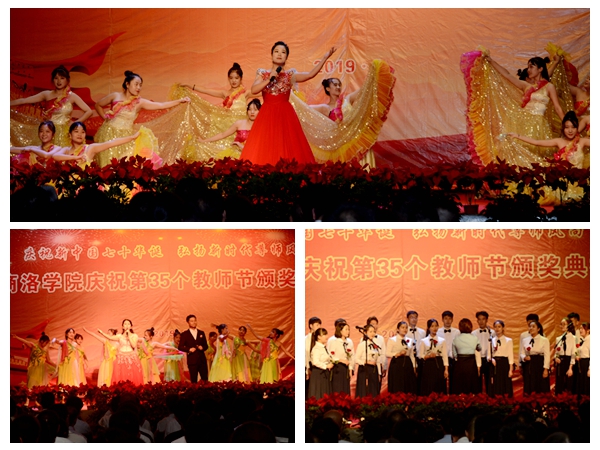 頒獎典禮上,我校師生表演了獨唱《我的深情為你守候》、歌曲《感恩的心》、詩朗誦《園丁頌歌》、小合唱《飛來的花瓣》、歌伴舞《不忘初心》等多個精彩節(jié)目,將藝術(shù)融入表彰,用動人舞姿、深情歡唱在舞臺上述說教育故事、贊頌教育事業(yè)、抒發(fā)教育真情,謳歌人民教師愛崗敬業(yè)、默默耕耘、無私奉獻(xiàn)的高尚情懷,演繹廣大教師熱情豪邁、奮發(fā)向上、勇往直前的美麗風(fēng)采,使整場頒獎典禮高潮迭起、掌聲不斷,最終,在一片歡慶祥和的氣氛中圓滿落下帷幕。