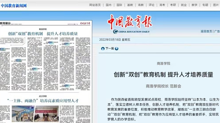 3月18日,校長(zhǎng)范新會(huì)在《中國(guó)教育報(bào)》第4版發(fā)表署名文章《創(chuàng)新“雙創(chuàng)”教育機(jī)制提升人才培養(yǎng)質(zhì)量》,全文如下: