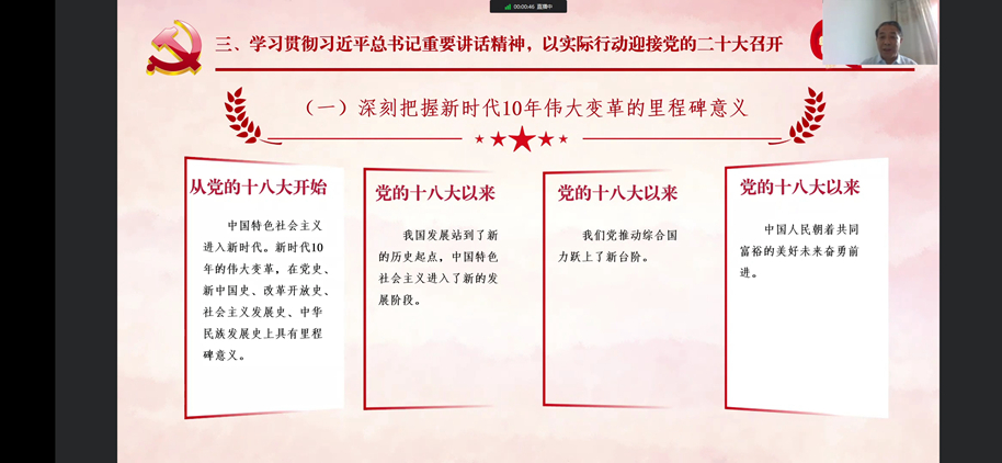 張志昌強(qiáng)調(diào),黨的二十大即將于10月份召開,這是在進(jìn)入全面建設(shè)社會主義現(xiàn)代化國家新征程的關(guān)鍵時刻召開的一次十分重要的大會,將科學(xué)謀劃未來5年乃至更長時期黨和國家事業(yè)發(fā)展的目標(biāo)任務(wù)和大政方針,事關(guān)黨和國家事業(yè)繼往開來,事關(guān)中國特色社會主義前途命運(yùn),事關(guān)中華民族偉大復(fù)興。作為青年學(xué)生,一是要堅定理想信念,主動“扣好人生的第一??圩印保杂X做社會主義核心價值觀的堅定信仰者、積極傳播者、模范踐行者,堅決聽黨指揮跟黨走,把對黨忠誠、對人民的熱愛始終牢記在心中、落實到行動中。二是要強(qiáng)化理論武裝,及時跟進(jìn)學(xué)習(xí),始終在政治立場、政治方向、政治原則、政治道路上同以習(xí)近平同志為核心的黨中央保持高度一致,堅定不移沿著習(xí)近平總書記指引的道路奮勇前進(jìn)。三是要增強(qiáng)實踐本領(lǐng),堅持學(xué)以致用,積極參加創(chuàng)新創(chuàng)業(yè)實踐,拓寬學(xué)習(xí)領(lǐng)域、優(yōu)化知識結(jié)構(gòu),培養(yǎng)創(chuàng)新意識、提高創(chuàng)新能力。