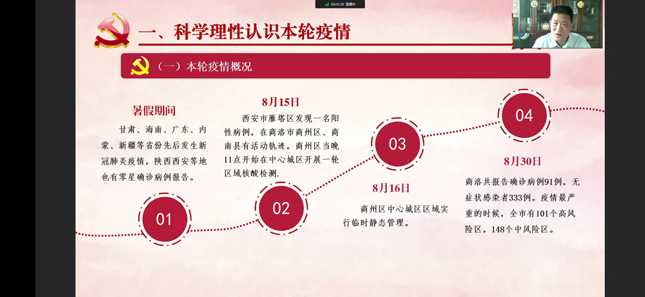 為深化大學(xué)生思想政治教育,強(qiáng)化師生疫情防控意識,引導(dǎo)廣大青年學(xué)生嚴(yán)格落實疫情防控各項工作要求,弘揚(yáng)偉大抗疫精神,以實際行動迎接黨的二十大勝利召開,8月31日下午,校領(lǐng)導(dǎo)張志昌、范新會、彭虎軍、劉勇、劉寶盈、王新軍、郭瑾以“云端授課”的形式,為全體學(xué)生講授“開學(xué)第一課”。