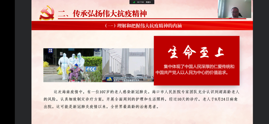 校長范新會在講授中引用多個鮮活事例,生動形象地闡述了生命至上、舉國同心、舍生忘死、尊重科學(xué)、命運(yùn)與共的偉大抗疫精神內(nèi)涵,系統(tǒng)性總結(jié)了中國戰(zhàn)“疫”取得的偉大成就。結(jié)合近期國內(nèi)、我省和商州區(qū)等疫情防控形勢,范新會強(qiáng)調(diào),青年學(xué)生要深刻理解和傳承弘揚(yáng)偉大抗疫精神,把握偉大抗疫精神的內(nèi)涵。一是要肩負(fù)使命擔(dān)當(dāng),與祖國和人民同呼吸共命運(yùn)。青年學(xué)生要把學(xué)問做在祖國大地上,做接地氣的真學(xué)問,要到祖國和人民最需要的地方去摸爬滾打,在疫情防控、科技創(chuàng)新、鄉(xiāng)村振興中發(fā)光發(fā)熱,從中找到人生真諦、生命價值和事業(yè)方向。二是要厚植愛國情懷,做積極戰(zhàn)“疫”的先行者。青年學(xué)生要帶頭遵守疫情防控各項要求,主動傳播疫情防控權(quán)威信息,分享正能量抗疫故事,解讀疫情防控方針政策。要敢于挺身而出,發(fā)揮所長、盡己所能為防控工作助力。要服從組織安排,落實安全防護(hù),規(guī)范有序參與疫情防控志愿服務(wù),在筑牢校園、社區(qū)防疫屏障中,展現(xiàn)商洛學(xué)院人應(yīng)有的昂揚(yáng)斗志和青春力量。