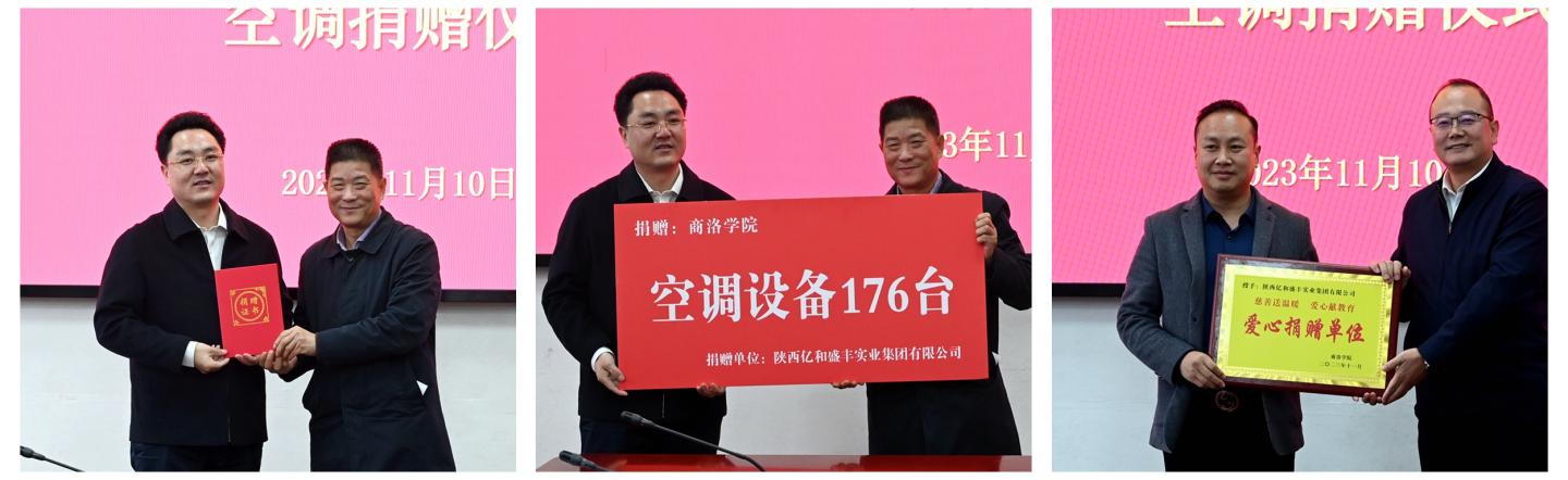 為進(jìn)一步改善學(xué)校辦學(xué)條件,經(jīng)友好協(xié)商,陜西億和盛豐實(shí)業(yè)集團(tuán)有限公司向我校丹江校區(qū)學(xué)生公寓樓C棟捐贈(zèng)價(jià)值60余萬元的176臺(tái)空調(diào)設(shè)備。11月10日,我校舉辦空調(diào)設(shè)備捐贈(zèng)儀式。陜西億和盛豐實(shí)業(yè)集團(tuán)有限公司董事局主席黃鵬、董事長黃濤出席捐贈(zèng)儀式。校長范新會(huì)代表學(xué)校接受捐贈(zèng)并向陜西億和盛豐實(shí)業(yè)集團(tuán)有限公司頒發(fā)捐贈(zèng)證書。副校長郭瑾主持捐贈(zèng)儀式并向企業(yè)頒發(fā)捐贈(zèng)牌匾。