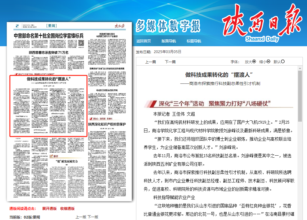 日前,《陜西日報(bào)》2版要聞欄目,以《做科技成果轉(zhuǎn)化的“擺渡人”》為題,專題報(bào)道介紹了商洛學(xué)院科研工作者把論文“寫”在商洛市“一都四區(qū)”建設(shè)產(chǎn)業(yè)鏈上的做法和經(jīng)驗(yàn)。