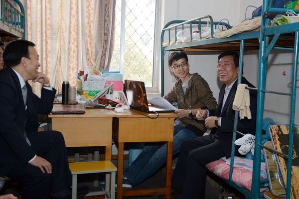 在彭虎軍和學校辦公室、保衛(wèi)處、后勤保障處相關(guān)負責人的陪同下,張玉明深入我校食堂、公寓和監(jiān)控中心視察。每到一處,張玉明都詳細了解相關(guān)安全制度及落實情況,仔細檢查安全設(shè)施的維護保養(yǎng)狀況,并和學生進行了現(xiàn)場交流,傾聽他們的意見和建議。在學生食堂,張玉明仔細檢查了操作間的衛(wèi)生條件、飯菜樣本,詢問了解飯菜品種、價格情況,嚴格要求食堂工作人員把好食品安全關(guān)。在學生公寓,張玉明認真檢查了公寓管理日志,詳細了解公寓安全管理各項制度的執(zhí)行落實情況,并在宿舍里向?qū)W生詢問了對學校各項工作的意見。