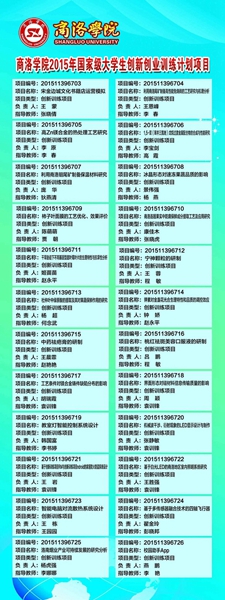 2015年,我校申報(bào)的《利用商洛尾礦制備高性能免燒磚的工藝研究與機(jī)理分析》等24項(xiàng)大學(xué)生創(chuàng)新創(chuàng)業(yè)訓(xùn)練計(jì)劃項(xiàng)目獲準(zhǔn)國(guó)家立項(xiàng),其中創(chuàng)新訓(xùn)練項(xiàng)目22項(xiàng)、創(chuàng)業(yè)訓(xùn)練項(xiàng)目1項(xiàng)、創(chuàng)業(yè)實(shí)踐項(xiàng)目1項(xiàng)。項(xiàng)目獲準(zhǔn)立項(xiàng)數(shù)量創(chuàng)歷史新高,居同類院校前列。