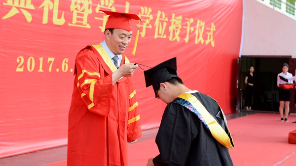 在學(xué)士學(xué)位授予儀式上,畢業(yè)生們依次走上主席臺,校長范新會、黨委副書記彭虎軍、副校長劉勇分別為獲得學(xué)士學(xué)位的畢業(yè)生正冠撥蘇、頒發(fā)學(xué)位證書,并與他們一一合影留念。