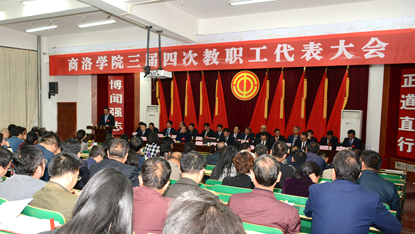 4月11日下午,在雄壯嘹亮的國(guó)歌聲中,商洛學(xué)院三屆四次教職工代表大會(huì)召開(kāi)。校領(lǐng)導(dǎo)龍治剛、范新會(huì)、王思懷、魏書(shū)堂、彭虎軍、劉寶盈,全校146位正式代表、5位列席代表出席大會(huì)。