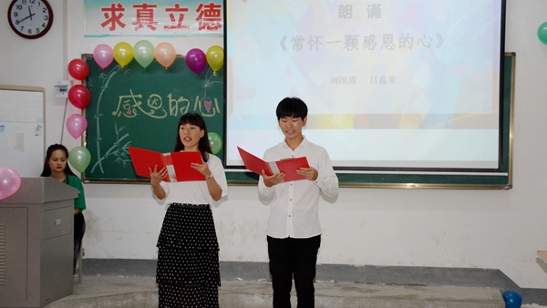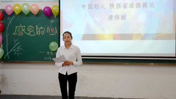 班會(huì)中,師生以小品《洗腳》、朗誦《常懷一顆感恩的心》、“我想對(duì)你說(shuō)”“說(shuō)出你的愛(ài)”等多種形式詮釋了親情和師恩的涵義,教育引導(dǎo)大家要知恩、感恩,以實(shí)際行動(dòng)回報(bào)關(guān)心支持自己的父母、老師和學(xué)校。中國(guó)好人、陜西省道德模范學(xué)生唐偉麗傾情講述了自己的感人事跡,分享了自己的成長(zhǎng)感悟,鼓勵(lì)大家珍惜大好年華、努力學(xué)習(xí)進(jìn)步。