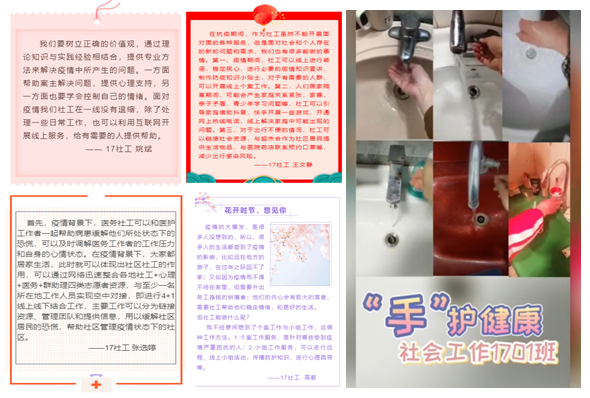 超人也會(huì)有鎧甲,防范意識(shí)不掉下。從“防護(hù)知識(shí)合集”到“宅家防護(hù)攻略”,從“疫情思考”再到“社工學(xué)子版洗手舞”,這其中囊括著社工學(xué)子的“助人自助”和社會(huì)工作專業(yè)的“用生命影響生命”。