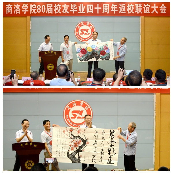 商洛學(xué)院80屆校友總聯(lián)絡(luò)人孟軍,在聯(lián)誼大會(huì)上代表全體校友感謝學(xué)校對(duì)此次活動(dòng)的重視和支持,并現(xiàn)場贈(zèng)送《桃李清風(fēng)報(bào)春曉·江湖夜雨思母?!贰赌档D》等書畫作品表達(dá)對(duì)母校的深情厚意。他在發(fā)言中表示,憶往昔,歲月崢嶸,母校承載了一代人的青春時(shí)光,不管如今身在何方,故土的鄉(xiāng)情、母校的恩情、師生的友情都絕不能忘;看今朝,倍加珍惜,80屆校友們親身經(jīng)歷了祖國改革開放40年的發(fā)展變化、親眼目睹了母校翻天覆地的發(fā)展壯大,這些來之不易的成果需要我們共同呵護(hù)珍惜;講未來,豪情滿懷,如今的祖國屹立于世界之林,揚(yáng)起了大國的風(fēng)帆,如今的商洛學(xué)院作為陜西省“一流學(xué)院”建設(shè)單位,已成長為一棵枝繁葉茂的大樹,站在新時(shí)代的節(jié)點(diǎn)展望未來的發(fā)展,我們信心滿滿。衷心祝愿祖國的明天更美好、母校的未來錦繡如花。