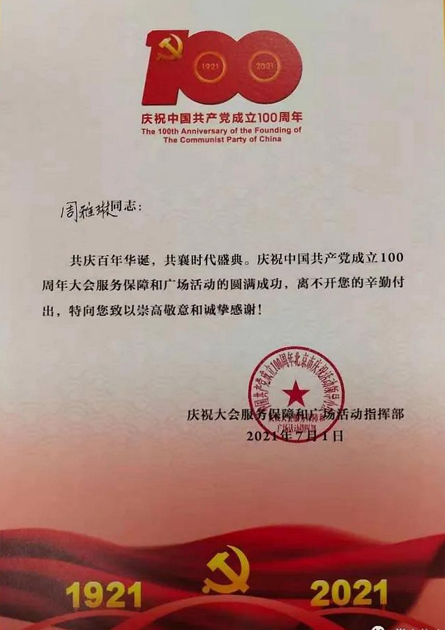 今年3月份,周雅琳上報了個人演奏視頻,通過了上級預選,4月下旬來到北京參加集訓。訓練期間,她始終以最高標準來嚴格要求自己,每天早起練基本功,吹長音,晚上加班加點唱譜。經(jīng)過她的不懈努力與刻苦訓練,終于,在7月1日當天,她與聯(lián)合軍樂團的戰(zhàn)友們一起,站在祖國的心臟---天安門廣場,奏響激情澎湃的樂章,為大會增添動人的華彩,也為商洛和學校爭得了榮譽,充分展示了我校學子昂揚向上的精神風貌。