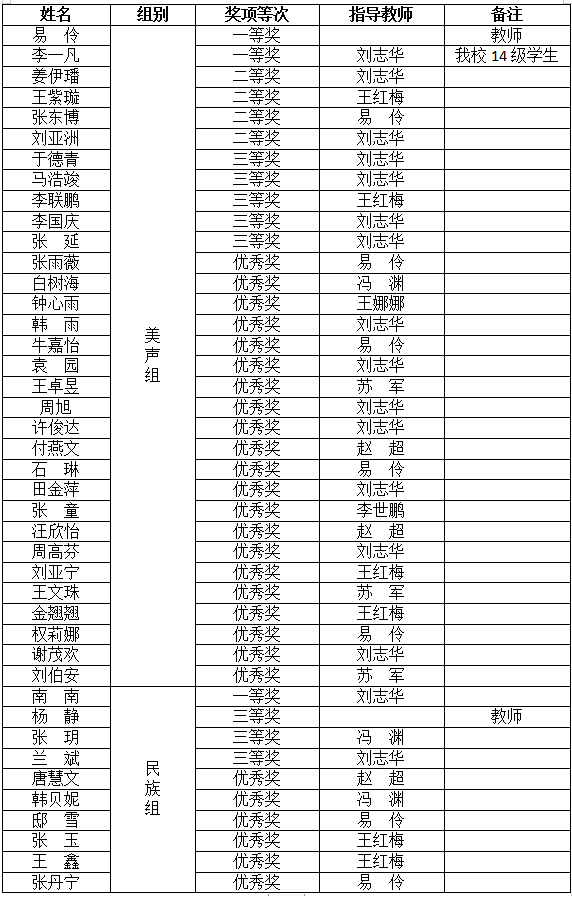 大賽設(shè)美聲組、民族組、幼兒組、少兒組、少年組5個組別,共146名選手參賽,包含我校音樂專業(yè)師生和各區(qū)縣聲樂人才。經(jīng)過激烈角逐,我校藝術(shù)學(xué)院教師易伶、學(xué)生南南分別獲得美聲組和民族組一等獎,學(xué)生姜伊璠、王紫璇、張東博,劉亞洲獲得美聲組二等獎,教師楊靜、學(xué)生于德青等8人獲得三等獎,27人獲得優(yōu)秀獎,8名教師獲優(yōu)秀指導(dǎo)教師獎。大賽還推選美聲組前5名和民族組前5名參加陜西省決賽,我校7位師生位列其中。