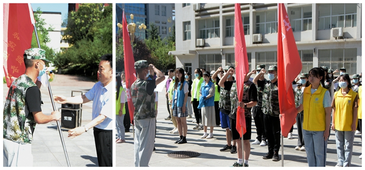 在熱烈的掌聲中,彭虎軍向退役軍人志愿服務(wù)隊授旗,志愿者代表譚佳豪接旗。