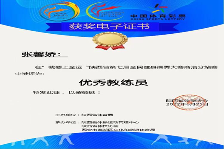 近期,陜西省第七屆全民健身操舞線上比賽圓滿落幕。我校派出由12名學生組建的健美操隊參加比賽,分別獲得大學乙組民族健身操舞(傣族舞)一等獎、輕器械健身操舞(自選)一等獎、有氧舞蹈一等獎及全國健美操大眾鍛煉標準(4-6級)一等獎的優(yōu)異成績,體育教學研究部教師張馨嬌被評為“優(yōu)秀教練員”。