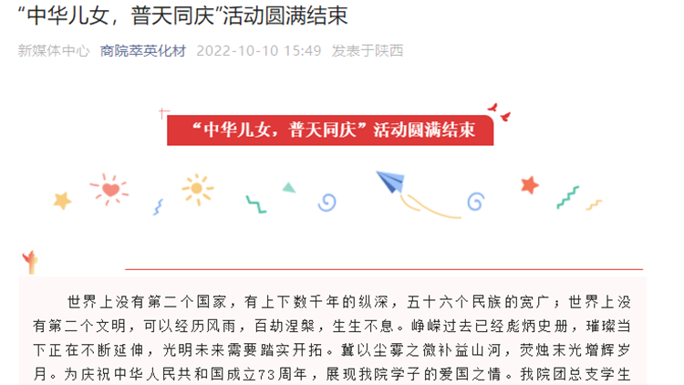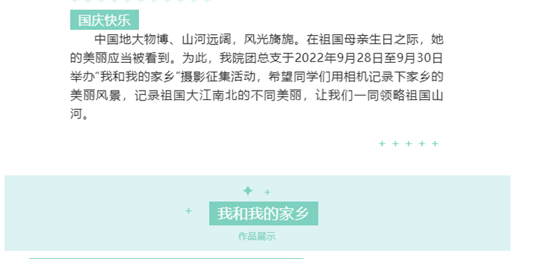 為深入開展“青春獻禮黨的二十大,強國有我新征程”主題宣傳教育活動,熱烈慶祝中華人民共和國成立73周年,引導和激勵廣大師生厚植愛國主義情懷,營造網(wǎng)絡(luò)文明新風,國慶節(jié)期間,我校組織開展了豐富多彩的“喜迎黨的二十大 歡度國慶節(jié)”系列主題活動。廣大師生通過各級各類網(wǎng)絡(luò)平臺和線上活動,用自己的方式為祖國送上美好祝福,禮贊新時代奮進征程,以良好的精神面貌和昂揚姿態(tài)喜迎黨的二十大勝利召開。