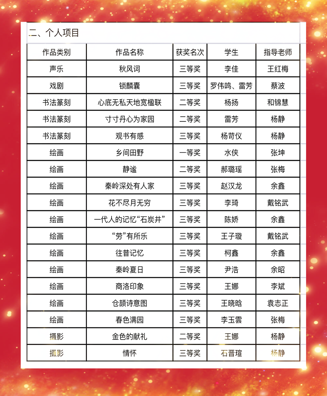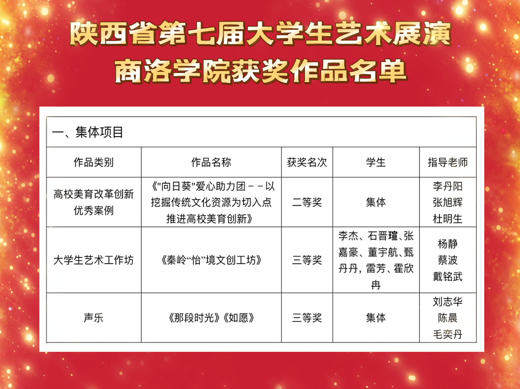 近日,由陜西省教育廳主辦的陜西省第七屆大學(xué)生藝術(shù)展演活動評選結(jié)果揭曉。我校師生在本屆藝術(shù)展演活動中取得優(yōu)異成績,喜獲21個獎項(xiàng),其中藝術(shù)表演類三等獎3項(xiàng);藝術(shù)作品類一等獎1項(xiàng)、二等獎4項(xiàng)、11項(xiàng);高校美育改革創(chuàng)新優(yōu)秀案例二等獎1項(xiàng);大學(xué)生藝術(shù)實(shí)踐工作坊獎三等獎1項(xiàng)。