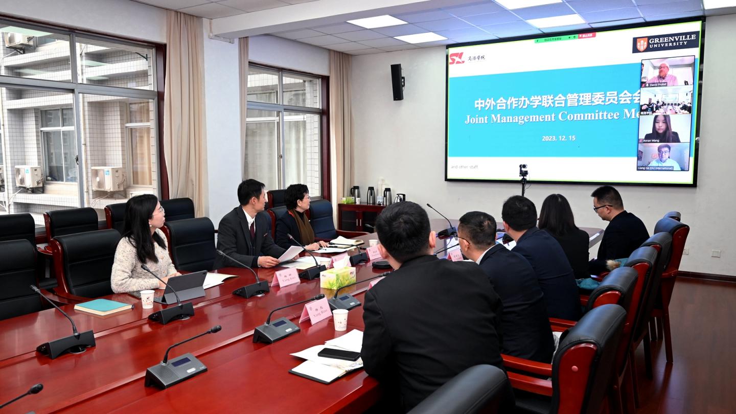 12月15日,我校召開中外合作辦學(xué)聯(lián)合管理委員會會議。校黨委副書記劉勇出席會議。國際合作與交流處負(fù)責(zé)人,電信學(xué)院黨政負(fù)責(zé)人及相關(guān)工作人員參加會議。美國格林威爾大學(xué)校長Suzanne Davis,工程系主任David Probst,國際處主任Liang Ge通過線上視頻形式參加會議。