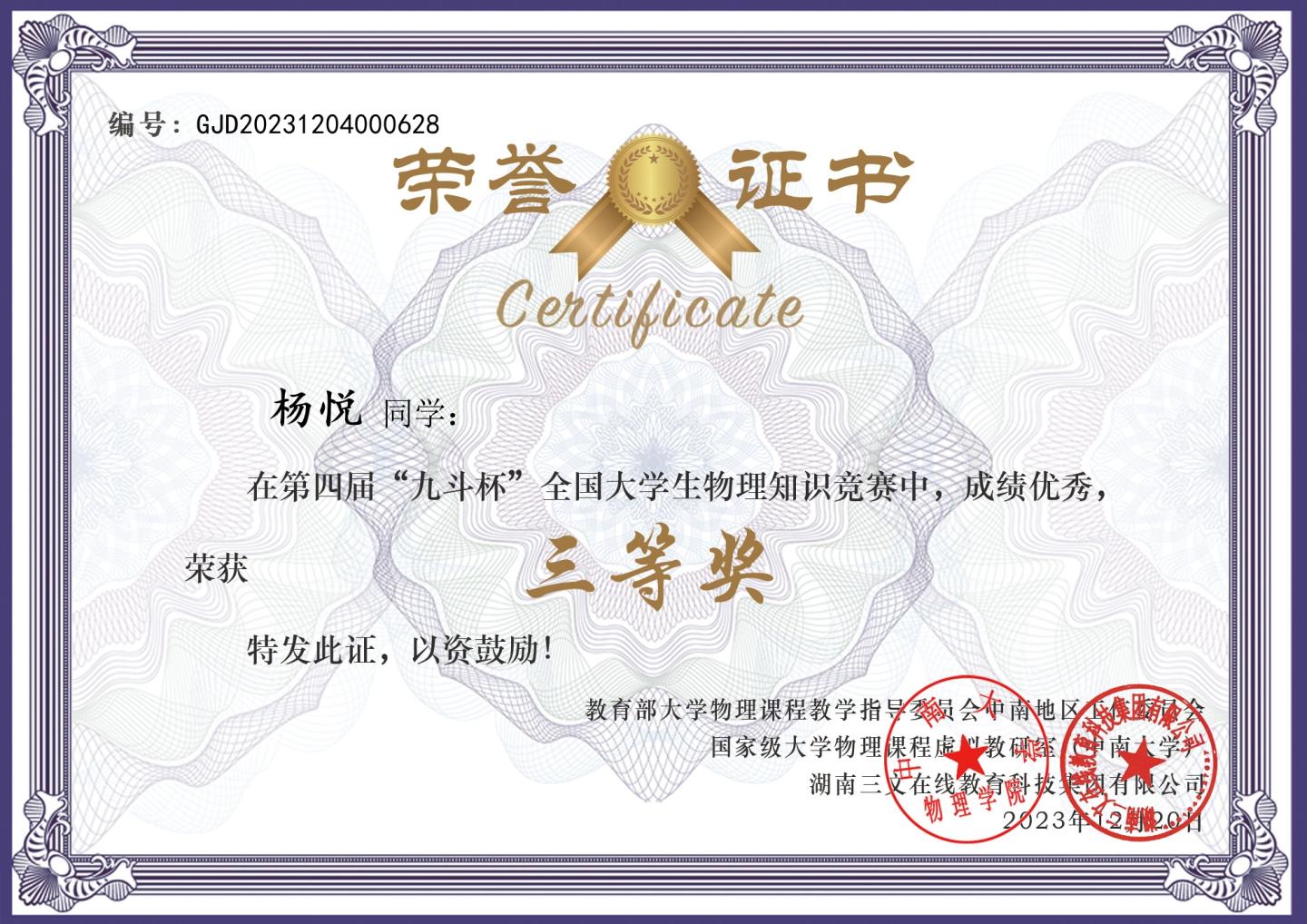 近日,由教育部大學物理課程教學指導委員會中南地區(qū)工作委員會、國家級大學物理課程虛擬教研室主辦的第四屆“九斗杯”全國大學生物理知識競賽結果揭曉。我校電信學院學生石宏江、閆露、楊悅、賀楊在決賽中喜獲全國三等獎。