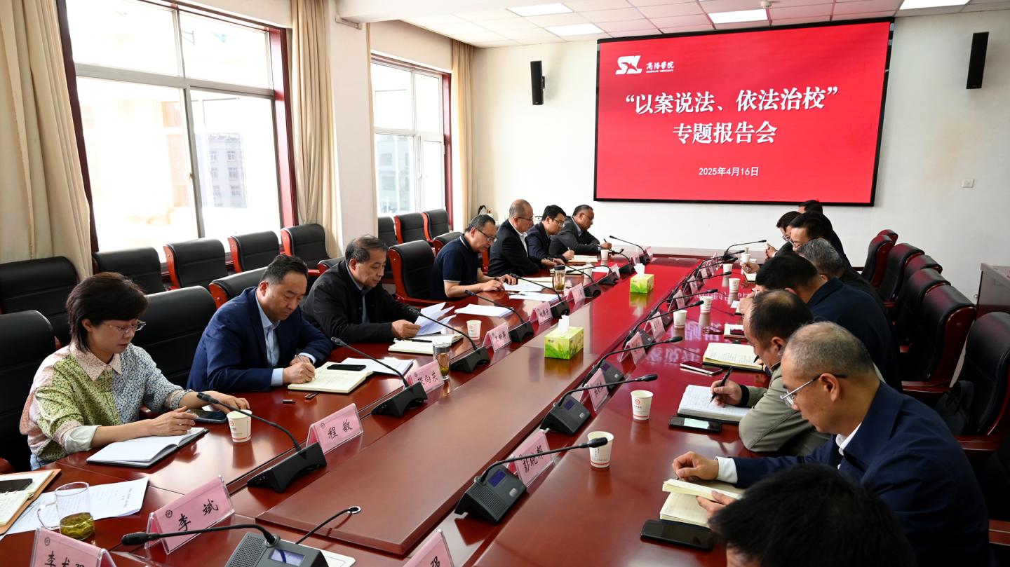 4月16日,學(xué)校召開“以案說法、依法治?!狈ㄖ螌n}報(bào)告會(huì)。學(xué)校特聘法律顧問、天乾律師事務(wù)所陳波律師為各部門負(fù)責(zé)人作依法治校專題報(bào)告。報(bào)告會(huì)由校黨委副書記劉寶盈主持。副校長王新軍、郭瑾、張向東出席報(bào)告會(huì)。