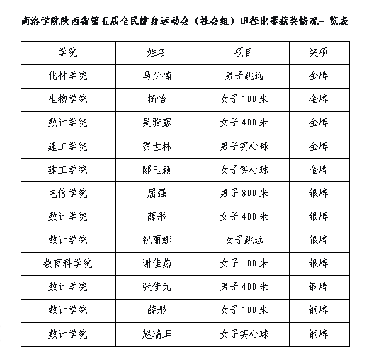 9月14日,陜西省第五屆全民健身運動會(社會組)田徑比賽在山陽縣落幕,在巔峰組比賽中,我校教師桑國鵬獲男子實心球第一名、王品獲男子跳遠(yuǎn)第二名、閆蘇榮獲女子100米第二名,牛洋洋獲女子實心球第二名。比賽由體育教學(xué)研究部主任黃顯忠擔(dān)任領(lǐng)隊,王健、王品、桑國鵬擔(dān)任教練,帶領(lǐng)我校學(xué)生取得5項金獎、4項銀獎、3項銅獎的好成績,充分展現(xiàn)了學(xué)校體育育人的成果和學(xué)子們良好的精神風(fēng)貌。