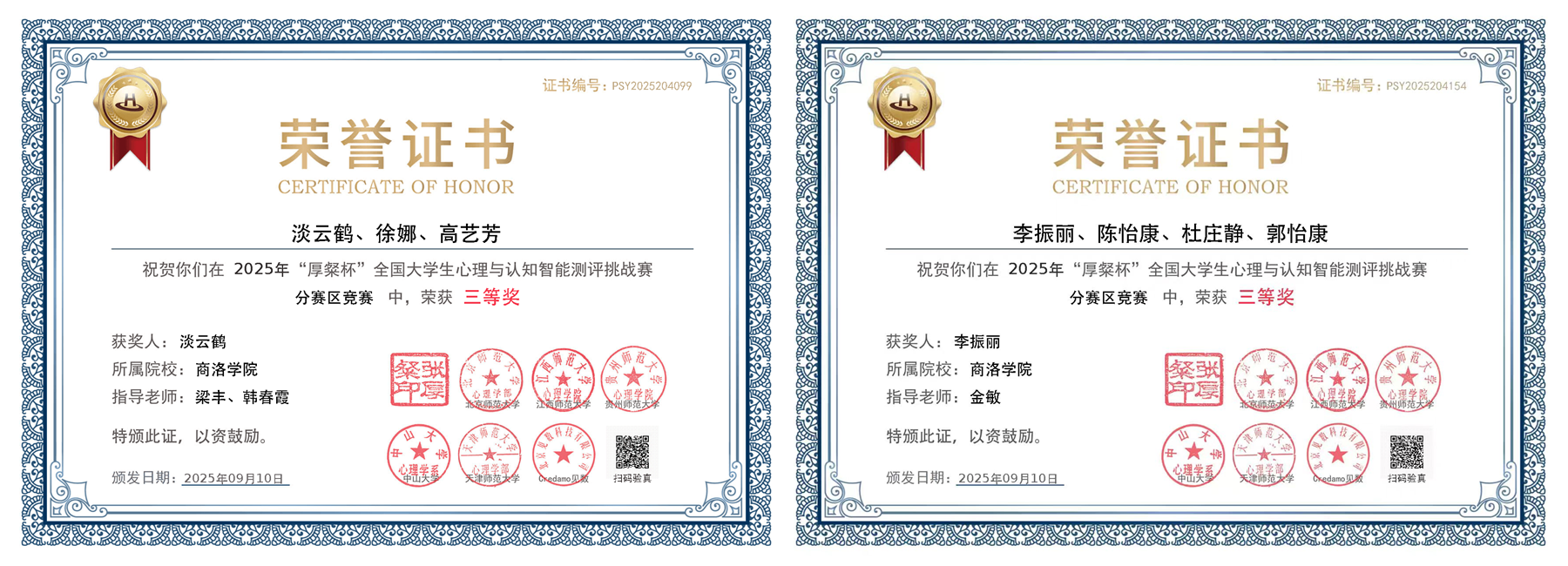 近日,由教育部高等學校心理學類專業(yè)教學指導委員會、全國大學生心理測量賽事聯(lián)盟主辦,北京師范大學等單位承辦的2025年“厚粲杯”全國大學生心理與認知智能測評挑戰(zhàn)賽西部賽區(qū)比賽圓滿落幕,我校教育科學學院應(yīng)用心理學專業(yè)2支參賽隊伍均榮獲三等獎,為省內(nèi)同類院校最好成績,充分展現(xiàn)了我校應(yīng)用心理學專業(yè)人才培養(yǎng)成效。