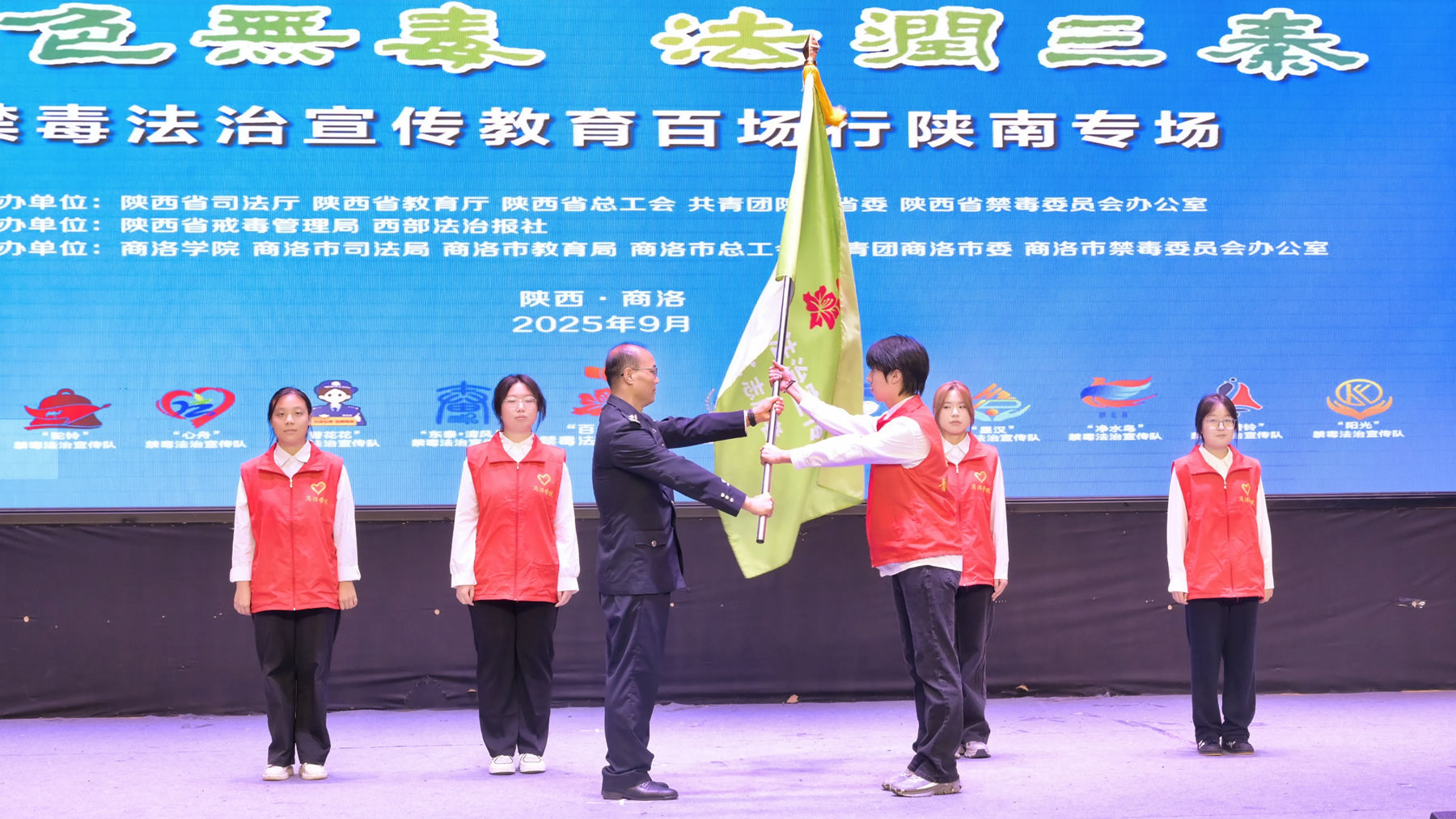省戒毒管理局教育矯治處處長曹生明為我校志愿者團(tuán)隊(duì)授“百合花禁毒法治宣傳團(tuán)商洛學(xué)院志愿者”旗幟并贈(zèng)送禁毒宣傳資料。百合花禁毒法治宣傳團(tuán)干警代表陳俞戈及我校禁毒宣傳學(xué)生志愿者代表分別作表態(tài)發(fā)言。