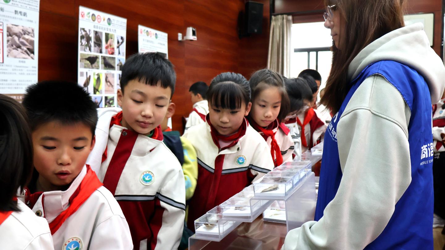 課堂講解之后,“秦小商”生態(tài)科普志愿服務隊策劃的鳥類保護科普展吸引了眾多目光。展板系統(tǒng)展示了紅尾水鴝、綠頭鴨等二十余種商洛代表性鳥類,每種均配有高清照片和科普二維碼,學生掃碼即可了解其外形特征、生活習性等知識。同學們或駐足辨識,或交流觀察體驗,在互動中深化了對本土鳥類的認知?!笆叭吮竟し弧睅淼牡陿吮菊挂矀涫荜P注。四十余種本土蝶蛾標本組成一個微縮的“昆蟲寶庫”,學生們興奮地討論“我見過這只蝴蝶!”“標本是怎么制作的?”,在近距離觀察中感受生物多樣性的真實與美麗?,F(xiàn)場的體驗式學習觀展,在潛移默化中植入了尊重生命、守護自然的理念。