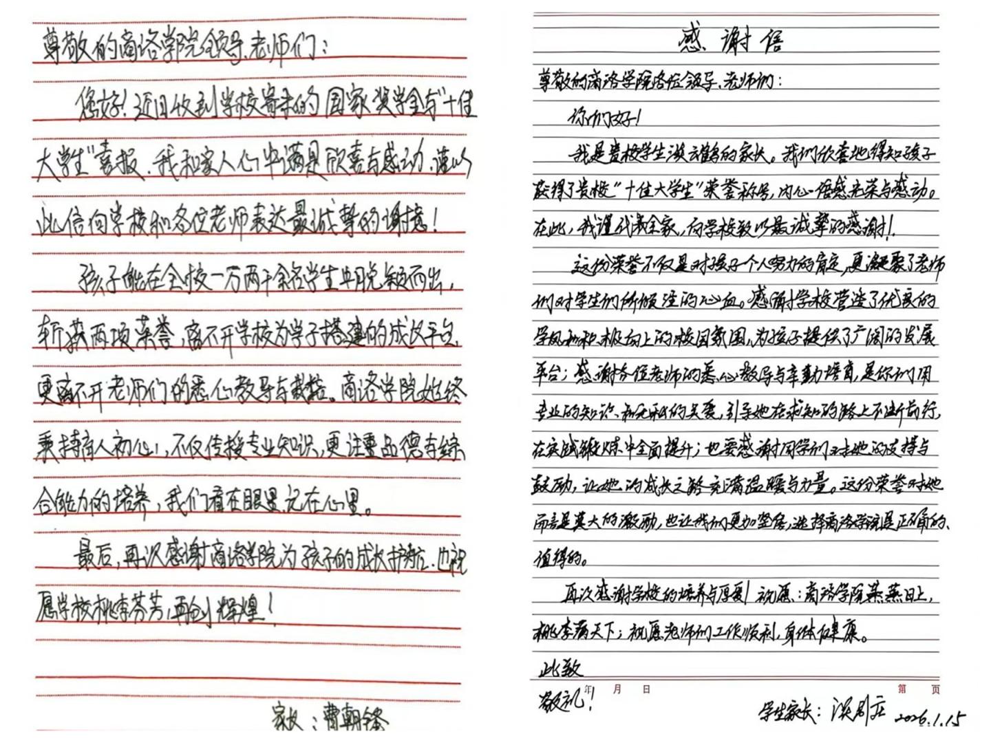 為深化家校協(xié)同育人,充分發(fā)揮思想政治教育與榮譽(yù)激勵的示范引領(lǐng)作用,近日,我校將2024-2025學(xué)年國家獎學(xué)金及“十佳大學(xué)生”的喜報寄送至37名獲獎學(xué)生家中。