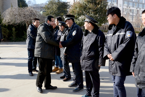 在黨政辦公室、保衛(wèi)處、后勤保障處負(fù)責(zé)人的陪同下,魏書(shū)堂、彭虎軍一行先后前往北新街校區(qū)、丹江校區(qū)各處門衛(wèi)、教學(xué)樓、公寓、圖書(shū)館、體育場(chǎng)值班室,后勤保障處公寓服務(wù)中心、水電班,保衛(wèi)處警務(wù)室、監(jiān)控室等一線崗位,與工作人員親切握手,代表學(xué)校黨政向大家拜年,對(duì)除夕之夜仍堅(jiān)守在工作崗位上的同志表示感謝,并親手送上節(jié)日慰問(wèn)品。在每一個(gè)慰問(wèn)地點(diǎn),校領(lǐng)導(dǎo)都詳細(xì)詢問(wèn)了各部門的工作情況,要求每位工作人員在春節(jié)期間一定要把安全穩(wěn)定放在首位,保證全校師生度過(guò)一個(gè)溫暖、祥和的春節(jié)。