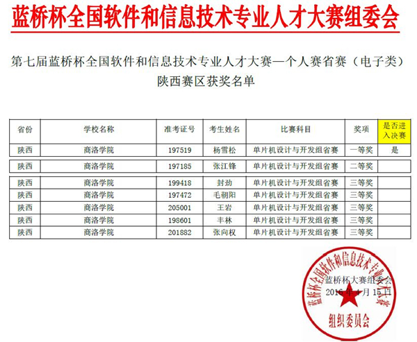 近日,第七屆“藍橋杯”全國軟件和信息技術(shù)專業(yè)人才大賽電子類陜西賽區(qū)比賽成績揭曉,我校電子信息工程1301班楊雪松獲得一等獎,電子信息科學(xué)與技術(shù)1302班張江鋒獲得二等獎,封勁、毛朝陽、王巖、豐林、張向權(quán)5名同學(xué)獲得三等獎。