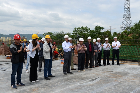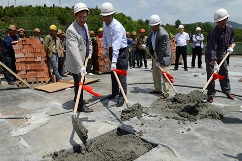 在儀式現(xiàn)場,劉寶盈及參加封頂儀式的代表們鏟起混凝土,共同為青年教師公寓和學(xué)生公寓樓封頂。