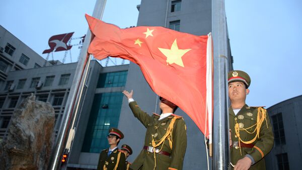 升旗儀式上,鮮艷的五星紅旗在晨曦中飛揚。