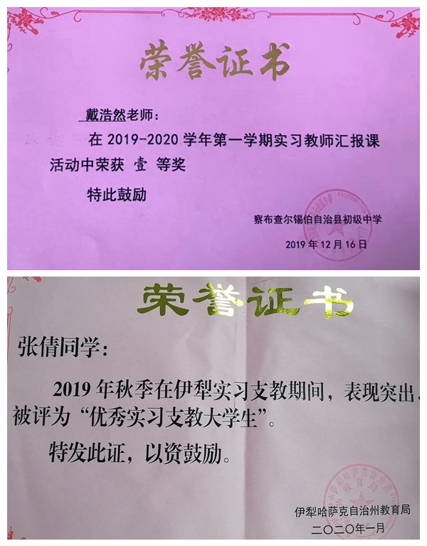 實習(xí)期間,我校支教學(xué)生始終心懷援疆支教的信念,立足支教工作崗位,以勇于擔(dān)當(dāng)?shù)姆瞰I精神,扎實的專業(yè)基礎(chǔ)知識,飽滿的工作熱情和勤奮務(wù)實的工作作風(fēng),認(rèn)真開展聽課、備課、研課、上課以及學(xué)生輔導(dǎo)答疑等各項教學(xué)工作,組織開展形式多樣的班級活動,積極參與實習(xí)學(xué)校的各項教學(xué)活動,展現(xiàn)了良好的精神風(fēng)貌,受到了州、市、縣各級教育局和支教學(xué)校的充分肯定,多名學(xué)生在學(xué)校賽教中獲獎,20多名學(xué)生被伊犁州或縣(市)教育局授予 “優(yōu)秀實習(xí)支教大學(xué)生”榮譽稱號。當(dāng)?shù)亟逃块T和各實習(xí)學(xué)校希望我校繼續(xù)選派優(yōu)秀學(xué)生赴疆支教實習(xí),為新疆基礎(chǔ)教育事業(yè)發(fā)展提供更多的師資人才力量。
