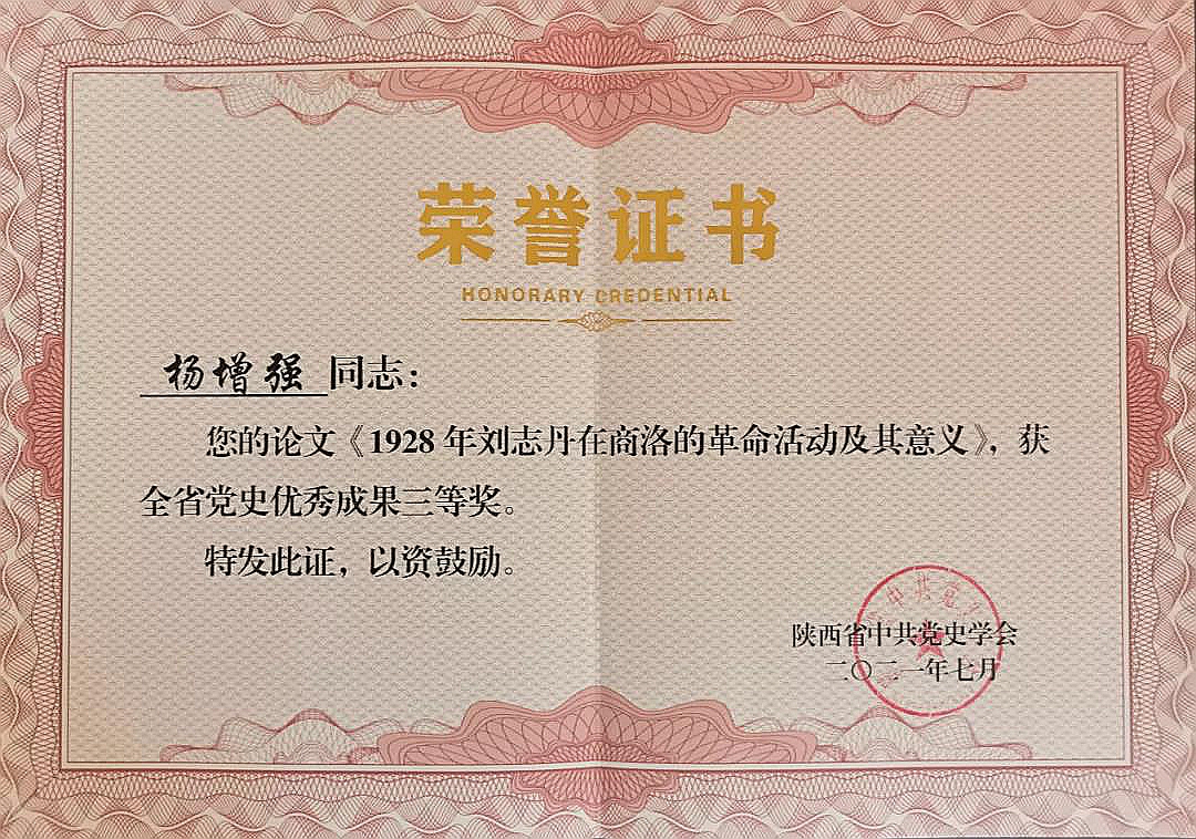 黨史學(xué)習(xí)教育開展以來,陜西省中共黨史學(xué)會在全省范圍內(nèi)開展了研究成果評獎活動。我校楊增強教授的論文《1928年劉志丹在商洛的革命活動及其意義》在評選活動中獲得全省黨史優(yōu)秀成果三等獎。