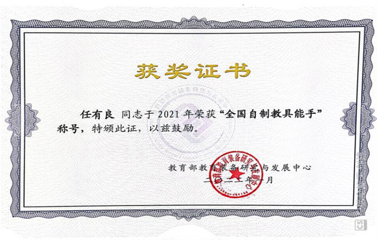 近日,教育部教育裝備研究與發(fā)展中心舉辦了“2021全國中小學(xué)優(yōu)秀自制教具展評(píng)活動(dòng)”,我校化學(xué)工程與現(xiàn)代材料學(xué)院教師任有良、曹寶月、劉萍的參展作品“一種雙控式乙炔演示實(shí)驗(yàn)裝置”獲全國一等獎(jiǎng),任有良獲“全國自制教具能手”稱號(hào)。